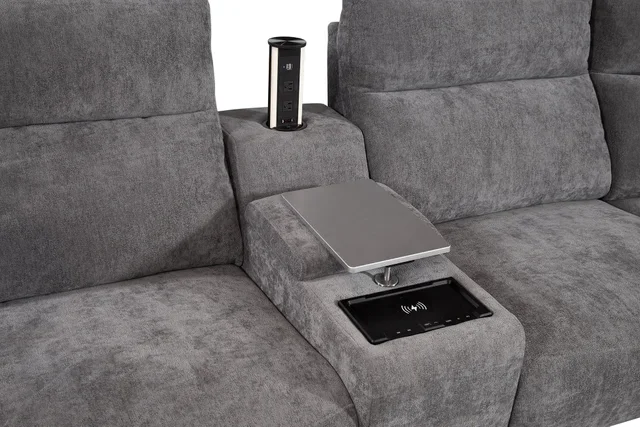 The sectional features a convenient storage console, tray table, and USB ports, keeping your devices charged and within reach. Additionally, it comes equipped with a wireless charger and speaker/audio output, making it easy to stream your favorite music or podcasts. The attached back and pillow arms add to the overall comfort and cozy feel of the sofa.