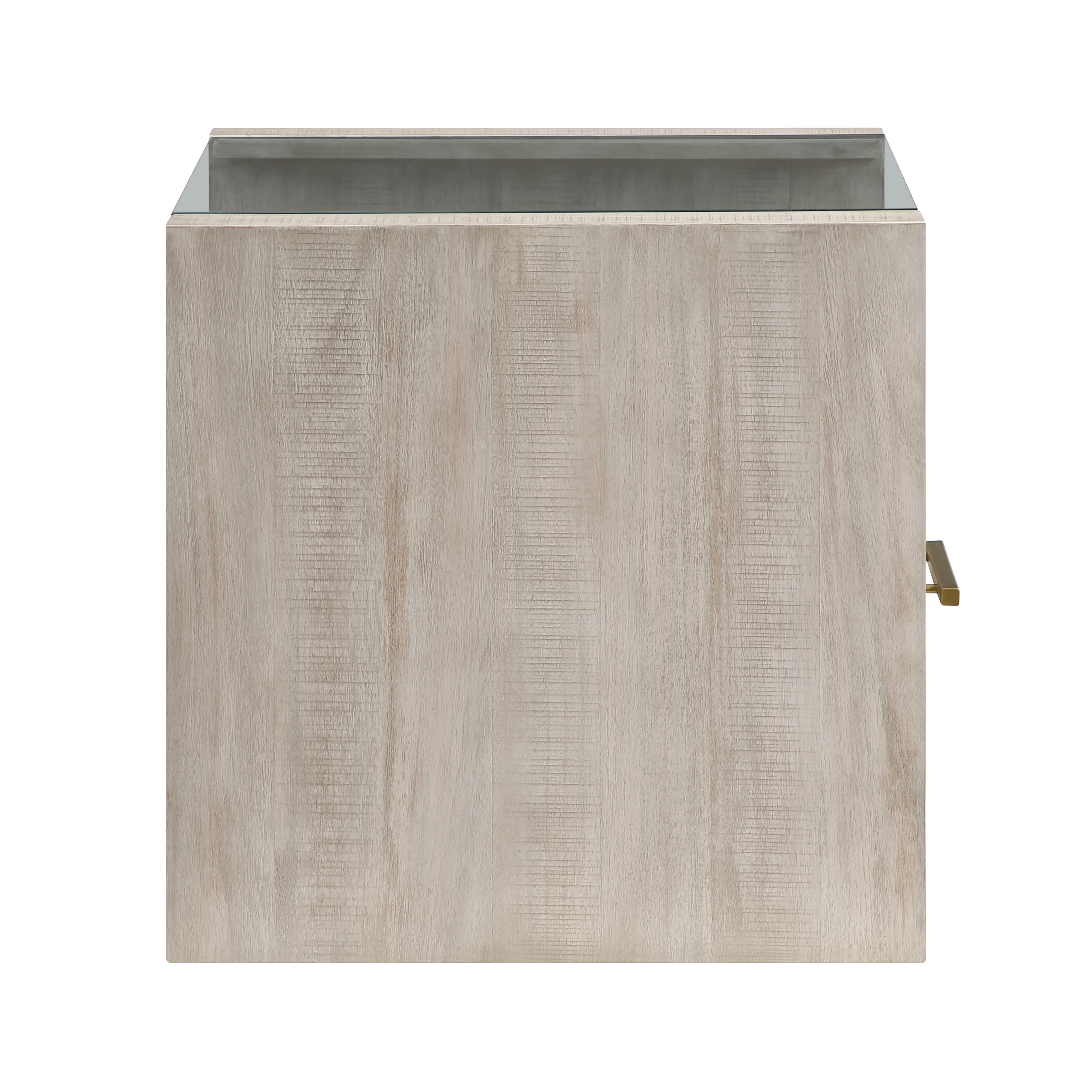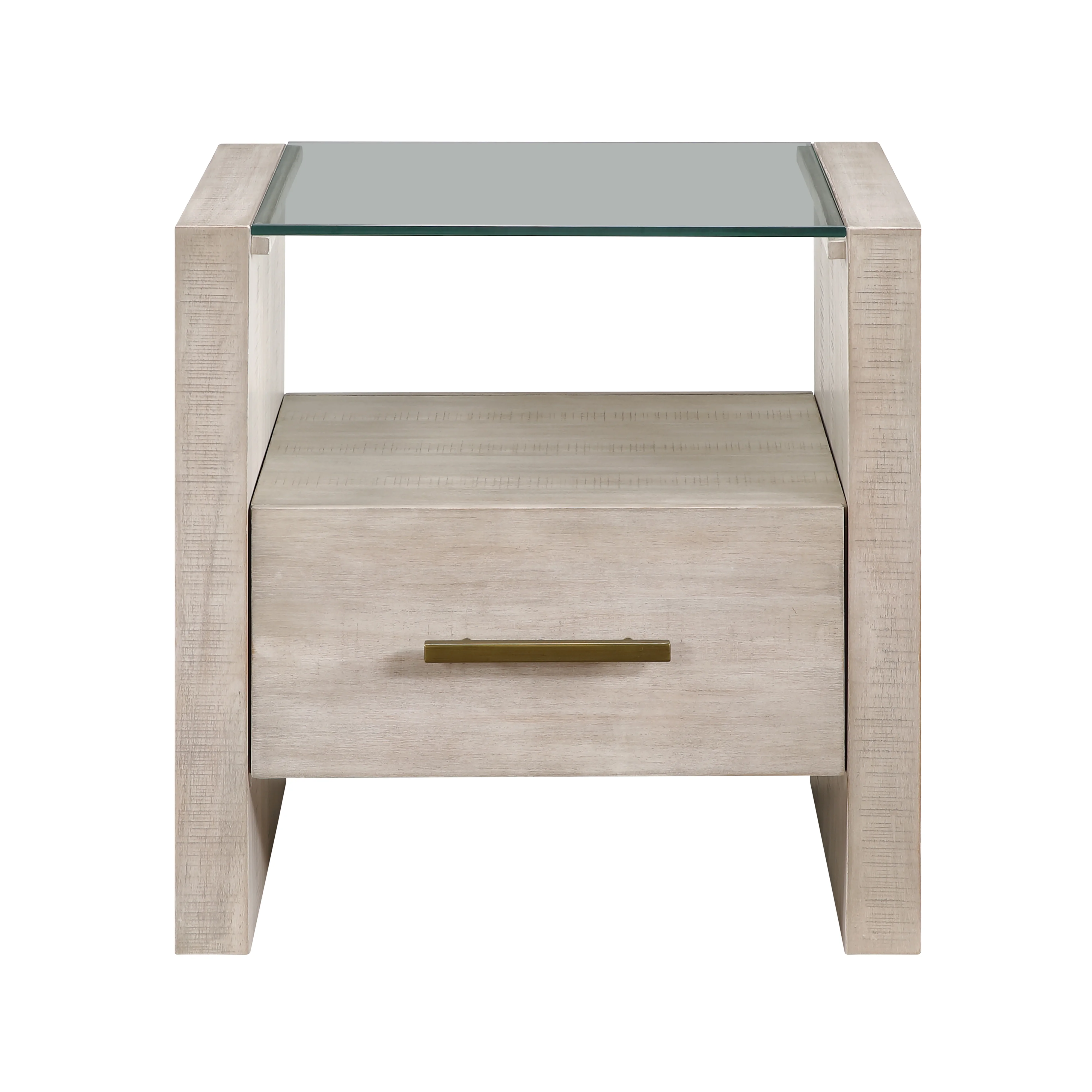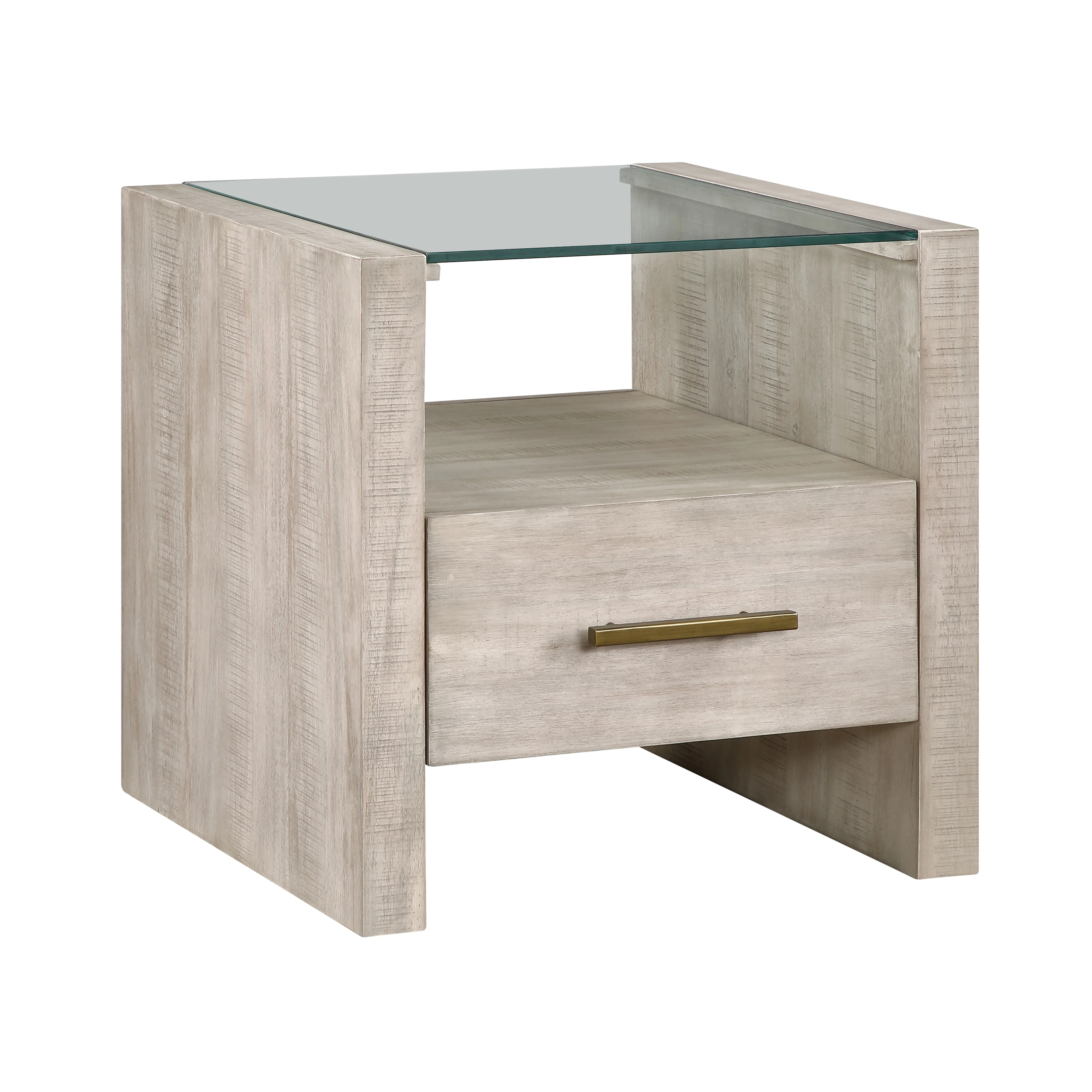 moreBring casual elegance to your living room with the Garland End Table, a sophisticated modern design relaxed with tasteful saw rasp distressing. Its clean lines and cool washed parchment finish create a beautiful side table. The clear glass top offers a lovely display area, while the one drawer provides convenient storage for essentials. With plastic glides for easy movement, this end table makes a perfect side companion for a chair or sofa. Functional and chic, it’s a great addition to any home.